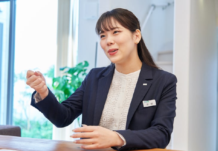 「不動産業界は男性社会」というイメージが少なからずあると思うのですが、ポラスではそういうことは全くありません。「1年目だから」や「女性だから」という見方はなく、若手も一社員として意見を求められますし、意見はきちんと管理職まで伝わります。また逆に、新入社員では言いにくいことを上司が代わりに管理職に伝えてくれることもあります。コミュニケーションがとりやすく風通しがいいのがすごく好きですし、ディスカッションを通して、日々成長している実感があります。ここまで成長している自分は、入社時には全く想像できなかったです。