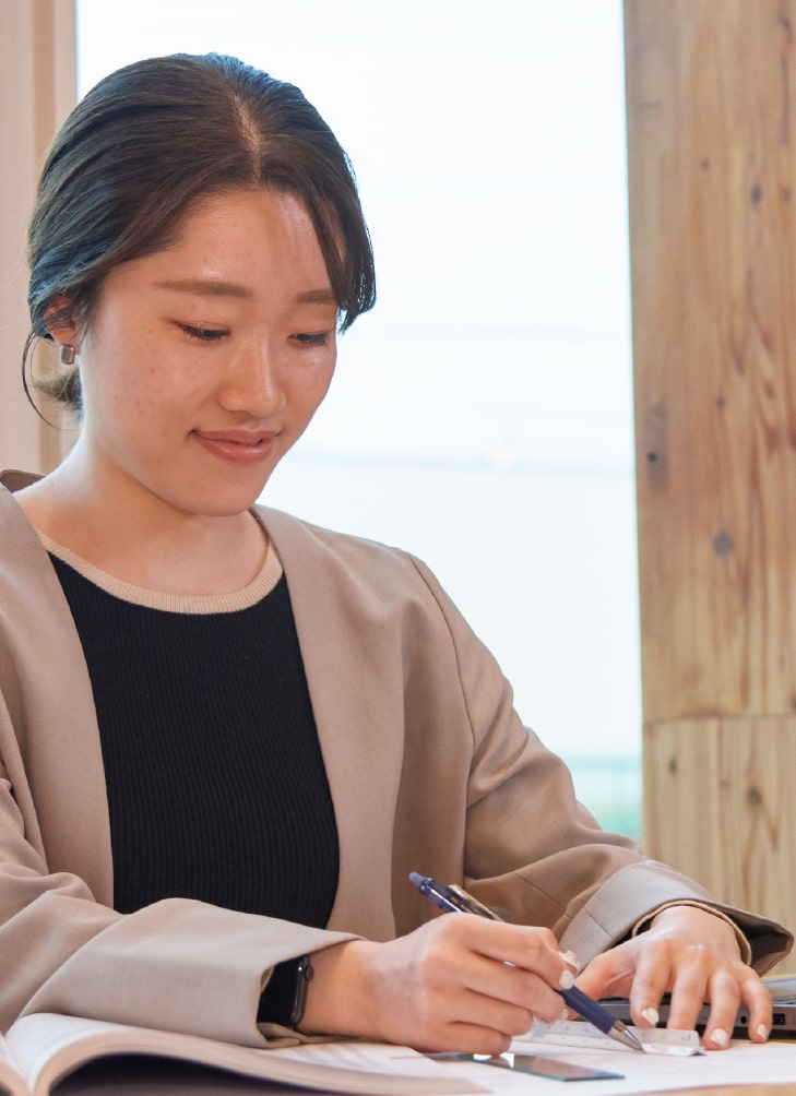 幼いころから間取り図を眺めるのが好きだった。「自分で家をつくりたい」と思うようになり、大学では建築学を専攻。数ある住宅メーカーがある中でポラスに惹かれたのは、「自分も住みたいと思う家」だったから。同じ研究室の先輩女性社員に、社風や働きやすさを聞き、入社を決める。現在は、注文住宅の実施設計を担当。